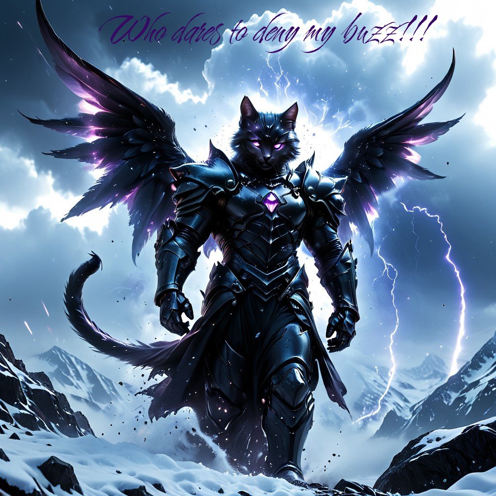 masterpiece, best quality, 8k, ultra-detailed, photorealistic, cinematic shot, dark fantasy, awe-inspiring, cosmic, divine, terrifying transformation BREAK A low-angle shot of an anthropomorphic warrior cat levitating above a storm-blasted mountain peak, ascending into godhood. Its matte black plate armor, including a featureless helmet, shatters as supernatural cobalt blue energy erupts from within. BREAK The energy arcs and flares around it, forming nascent wings of pure light. Light seeps from the helmet s seams before fracturing. Its body arches back, helmeted head thrown skyward, a silent scream radiating force. BREAK A blizzard whips around, snow vaporizing before touching its incandescent form. Above, storm clouds tear open, revealing a swirling cosmic vortex. The cat becomes the sole, violent light source, illuminating the peak in pulsating blue glow. BREAK dark, chiaroscuro, low-key, dark aura, hkstyle, ral-motoroil, wearing armor, feline form, detailed eyes, cinematic lighting, miasma, purple aura