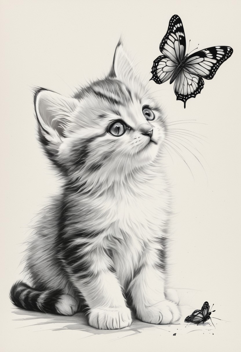 Cute Cartoon Character, 1 extremely cute kitten is sitting, looking up, ((((1 butterfly sitting on the kitten snacking)))), butterfly and kitten looking at each other, ((white background)), Black Pencil Drawing, Black and White Drawing, Graphite Drawing, ,ral-dissolve, realistic, highly detailed, extremely detailed, masterpiece, award winning