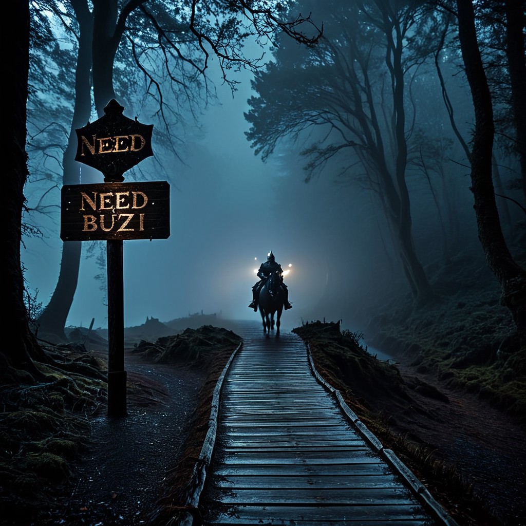 (masterpiece, best quality, ultra-detailed, sharp focus, cinematic shot), dark fantasy art, high contrast, atmospheric. (A lone knight in intricate, dark steel plate armor, mounted on a powerful black warhorse:1.2). (The knight travels on a dirt path through an ancient, misty forest at night.) (Eerie fog and glowing miasma cling to the ground. Pale moonlight filters through the gnarled, mossy branches.) (In the foreground, a weathered wooden road sign with the text "need buzz" clearly written on it:2). dark, chiaroscuro, low-key, dark aura, hkstyle