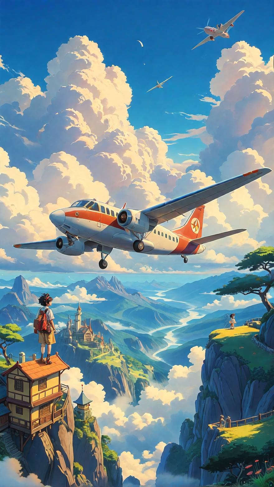 ethereal fantasy concept art of wanderer between worlds, Smooth_Quality ,lazypos , lazyup, cruising at high altitude, the airplane soaring above the clouds, with a clear blue sky ,masterpiece, 32k, (best quality:1.2), high res, amazing quality, chromatic color, adventurous, <lora:extremely_detailed:1.1> extremely detailed, <lora:add-detail-xl:1>, <lora:EldritchRomanceIllustration1.3.1:0.7> ,, magnificent, celestial, ethereal, painterly, epic, majestic, magical, fantasy art, cover art, dreamy, (Studio ghibli style, Art by Hayao Miyazaki:1.2), Anime Style, Manga Style, Hand drawn, cinematic, Sharp focus, humorous illustration, big depth of field, Masterpiece, concept art, trending on artstation, Vivid colors, Simplified style, trending on ArtStation, trending on CGSociety, Intricate, Vibrant colors, Soft Shading, Simplistic Features, Sharp Angles, Playful, Realistic anime art style, combines anime aesthetics with lifelike details, detailed character designs, intricate backgrounds, immersive storytelling