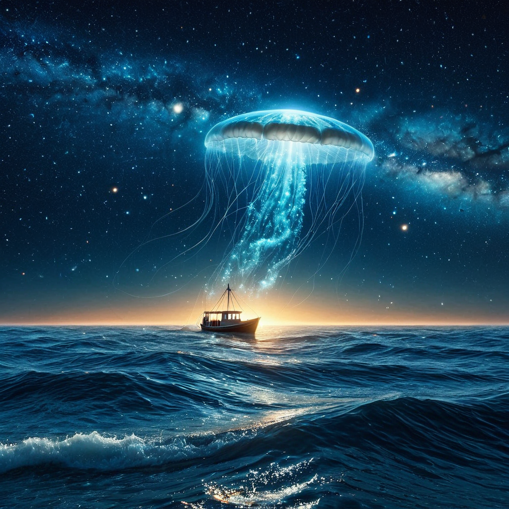 A vast calm sea under twilight, the water surface replaced with galaxies instead of reflections, every wave crest shining with stars, a single fishing boat drifting across the Milky Way, cosmic jellyfish glowing below the surface, atmospheric photoreal surrealism, high detail realism, dreamlike composition, melancholic beauty, ethereal stillness CosmicStyle