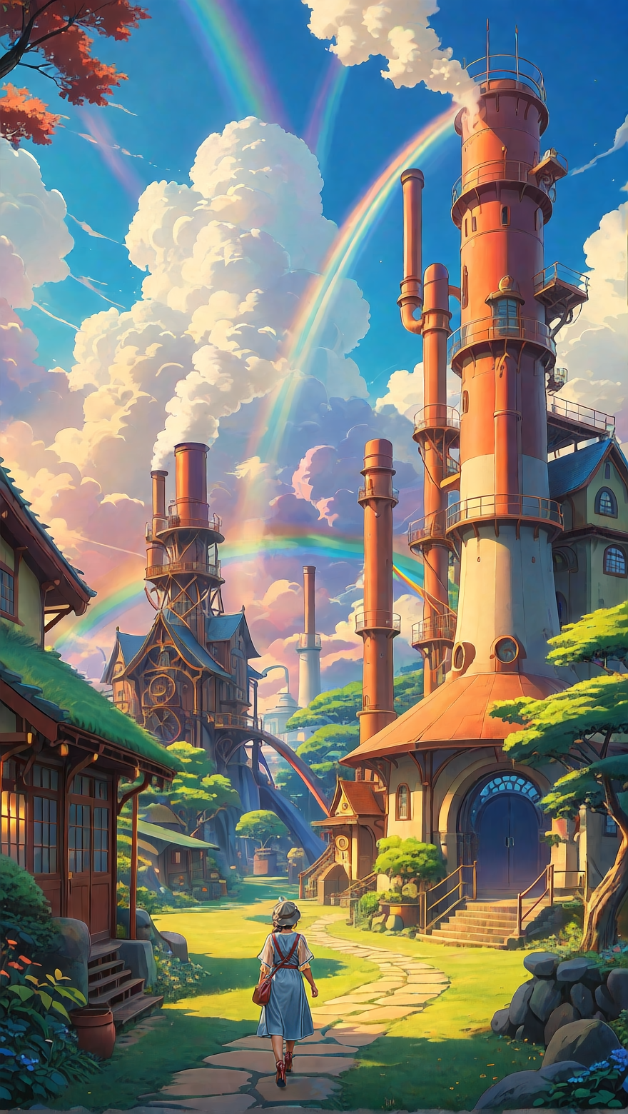 ethereal fantasy concept art of wanderer between worlds, Smooth_Quality ,lazypos , lazyup, an industrial complex, with smokestacks, steel structures, a gritty, mechanical feel ,masterpiece, 32k, (best quality:1.2), high res, amazing quality, pulsating color, magical, rainbow light effect garden, <lora:extremely_detailed:1.1> extremely detailed, <lora:add-detail-xl:1>, <lora:EldritchRomanceIllustration1.3.1:0.7> ,, magnificent, celestial, ethereal, painterly, epic, majestic, magical, fantasy art, cover art, dreamy, (Studio ghibli style, Art by Hayao Miyazaki:1.2), Anime Style, Manga Style, Hand drawn, cinematic, Sharp focus, humorous illustration, big depth of field, Masterpiece, concept art, trending on artstation, Vivid colors, Simplified style, trending on ArtStation, trending on CGSociety, Intricate, Vibrant colors, Soft Shading, Simplistic Features, Sharp Angles, Playful, Realistic anime art style, combines anime aesthetics with lifelike details, detailed character designs, intricate backgrounds, immersive storytelling