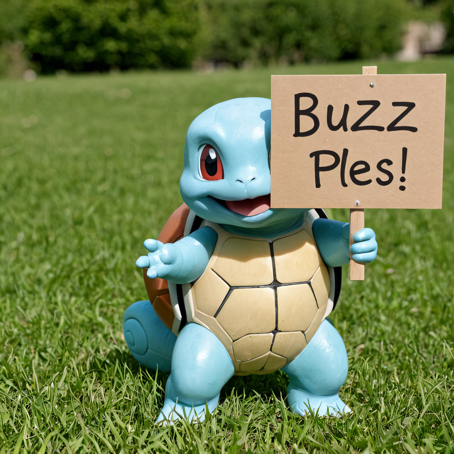 Squirtle holds a sign that says "Buzz pls". sunny day, green grass, happy aesthetics, blurry backround, depth of view, close-up